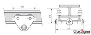 Chariot manuel de direction 3000 kg. Ce matériel permet le positionnement exact ou le déplacement aisé de charges importantes avec un palan à chaîne (électrique, manuel ou pneumatique). Il peut être monté sur tous types de profilés (IPN, IPE, HEA, HEB).