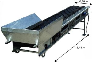 Convoyeur à bande 3 m. Monté en série, ce tapis de convoyage permet le transport de matériaux solides et non dangereux (sable, gravillon, terre, petit gravât, etc.) sur de grande distance. Grace à un angle de montée pouvant atteindre 40°, ce transporteur peut accéder à des escaliers ou charger directement une benne à gravât. Equipé de trémies de chargement, il est également possible d’utiliser une mini-pelle pour le chargement.