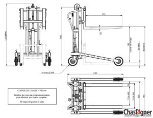 • Est équipé d’un levier de pompage pour l’élévation des fourches