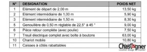 • Fournie avec une échelle de base de 2 m, trois échelles de 2 m, une échelle de 1,5 m, une échelle de 1 m, une genouillère de 22,50° à 45 °, un plateau galvanisé et d’un treuil avec une télécommande et un fin de course haut et bas