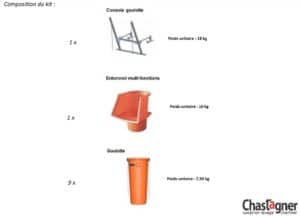 • Le kit se compose de neuf goulottes avec chaînes, d’un entonnoir multi-fonctions et d’une console complète
