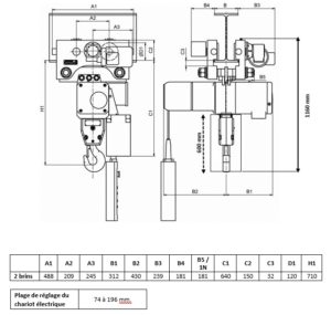 • La vitesse de déplacement du chariot de translation électrique est variable : 4 ou 16 m / par minute