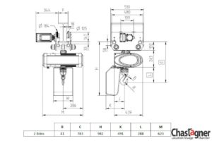 Palan électrique à chaîne 5000 kg avec chariot électrique intégré disposant d’une grande hauteur de levage. Ce matériel peut s’installer sur de multiples supports (échafaudage, potence, portique…) en intérieur ou en extérieur de bâtiment. Ce palan à chaîne a été spécialement étudié pour le levage de charges lourdes en toute sécurité. Fourniture et pose de fer sur demande ainsi que l’installation de radiocommande.