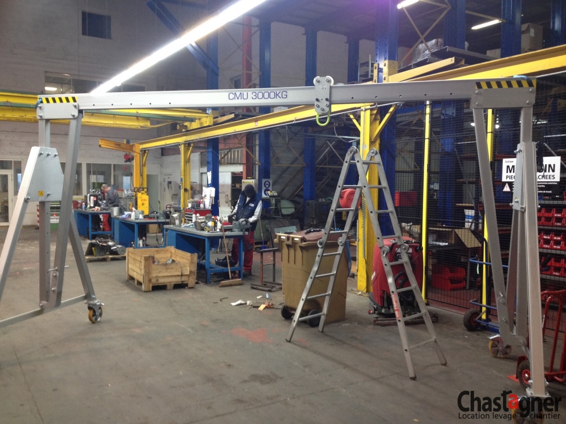 Portique en aluminium roulant 3000 kg / 4 m. Ce portique de levage mobile bipoutre est réglable en hauteur et en portée. Léger et de faible encombrement, il se transporte et se met en œuvre facilement sans outillage particulier. Portique déplaçable en charge, il peut être utilisé en intérieur ou en extérieur pour des travaux de pose, dépose ou positionnement de charges.